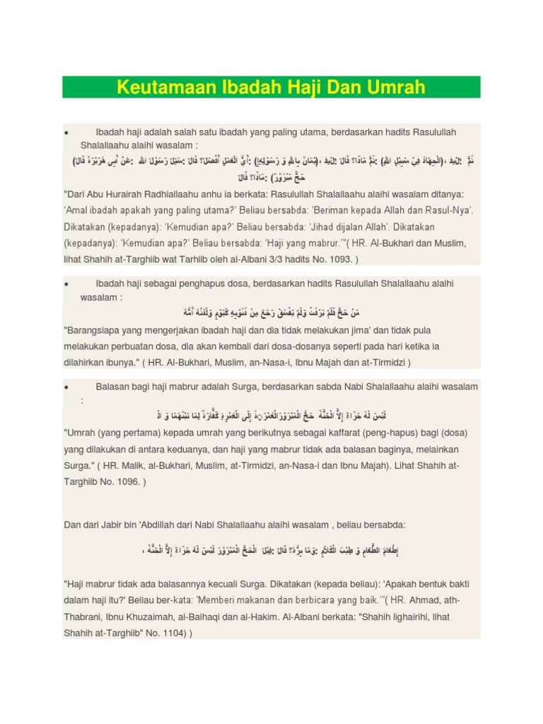Keutamaan umroh dan haji. Di dalam kedua ibadah tersebut terkandung hikmah dan pelajaran yang banyak dan sangat berharga. Rasulullah shallallahu alaihi wa sallam bersabda jika ramadhan tiba berumrahlah saat itu karena umrah ramadhan senilai dengan haji hr. Masih banyak hikmah hikmah lainnya yang bisa dipetik dari pelaksanaan ibadah haji dan umrah.