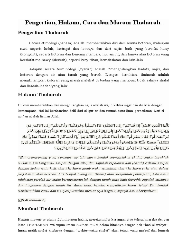 Pengertian macam dan cara thaharah pengertian thaharah thaharah menurut bahasa berarti bersuci. Kemudian secara istilah thaharah artinya menghilangkan hadats najis dan kotoran dari tubuh yang menyebabkan tidak sahnya ibadah lainnya menggunakan air atau tanah yang bersih. Kalau sebelumnya kita sudah mengulas tentang macam macam.