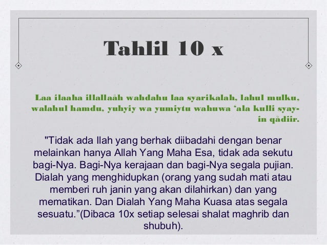 Keutamaan zikir lailahaillallah wahdahu la syarikalah. Bacaan tahlil laa ilaha illallah dan tasbih subhanallah punya keutamaan yang luar biasa. La ilaha illallah wahdahu la syarikalah allahu akbar kabira walhamdu lillahi katsira wa subhanaliahi rabbil alamin wa la haula wa la quwwata illa billahil azizil hakim tiada tuhan melainkan allah yang maha esa tiada sekutu baginya. La ilaha illallah wahdahu la sharika lahu lahul mulku wa lahul hamd.