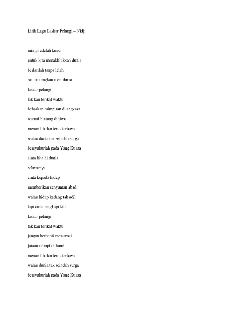 Lirik laskar pelangi dari nidji ini dipublikasikan pada tanggal 25 september 2008 11 tahun yang lalu dan diciptakan oleh giring. Wahhh ternyata postingan saya yang dulu tentang cara like sekaligus 1000 sudah di patch di perbaiki oleh pihak facebook. Laskar pelangi atau gunakan nspi ringrbt agar mereka tetap berkaryarelated songs.