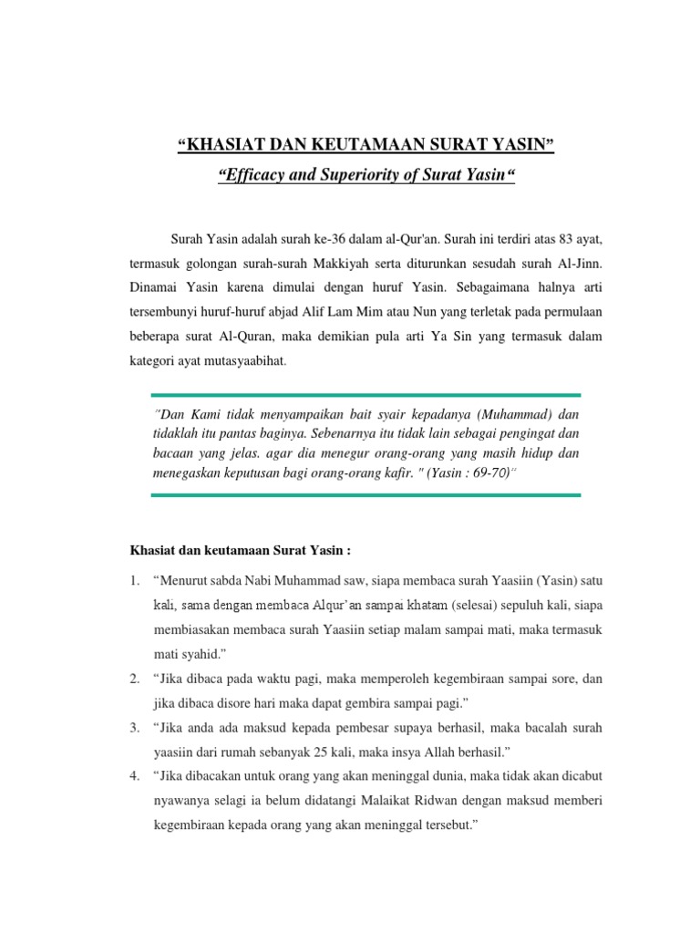 Dinamakan yasin karena surah ini dimulai dengan huruf yaa siin yang terdapat pada ayat pertama surat ini. Yasin fadilah halaman 13. Berikut ini bacaan surat yasin arab dan terjemah bahasa indonesia disertai keutamaan dan khasiat yang luar biasa.